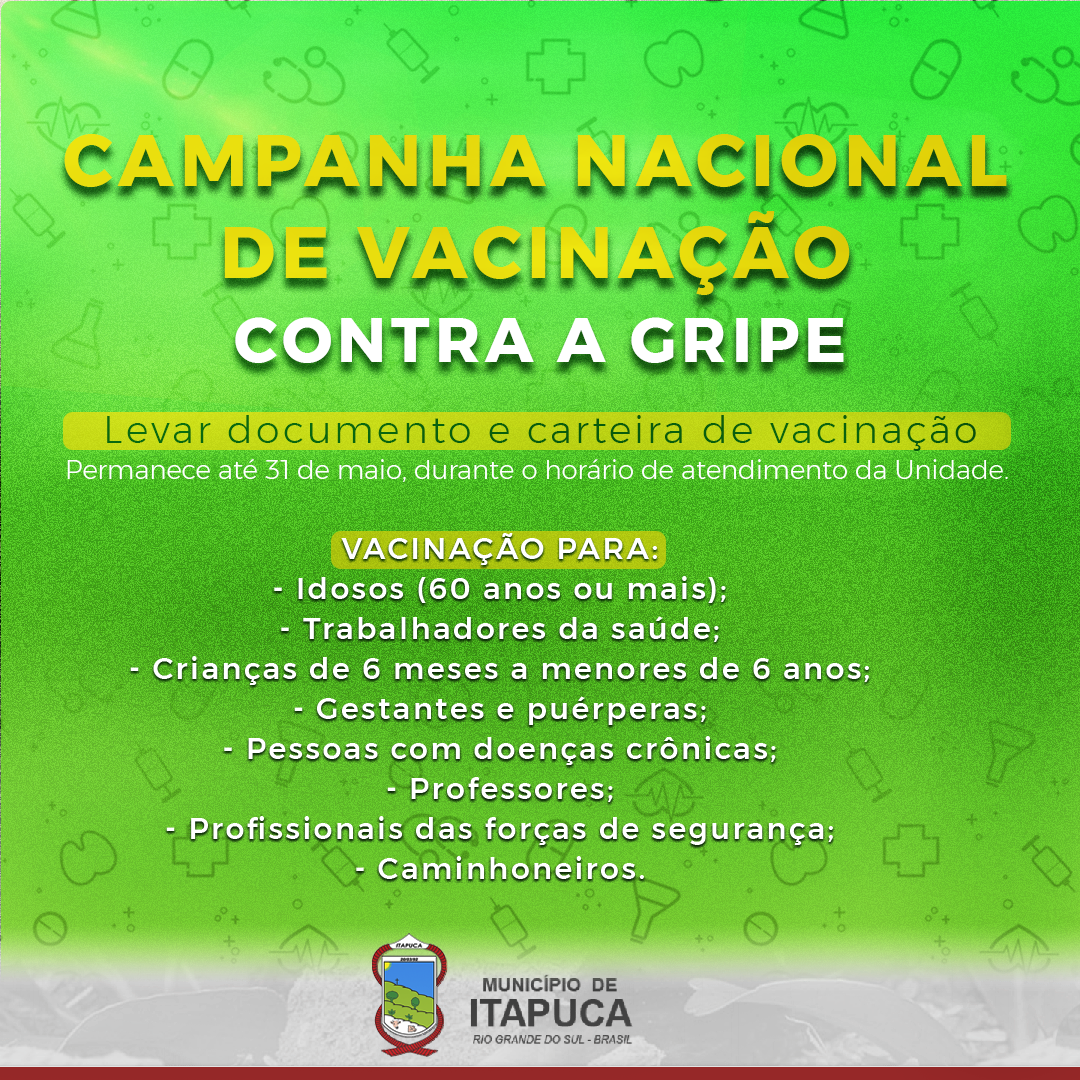 Campanha Nacional de Vacinação contra a Gripe, o período de vacinação permanece até o dia 31 de maio, durante o horário de atendimento da Unidade.