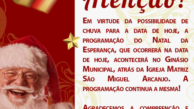 21 dez 2025 ATENÇÃO! O EVENTO DO NATAL DA ESPERANÇA DE HOJE OCORRERÁ NO GINÁSIO MUCIPAL! 21 de dezembro de 2025 Itapuca - Imprensa Notícias ATENÇÃO!Em virtude da possibilidade de chuva par...leia mais