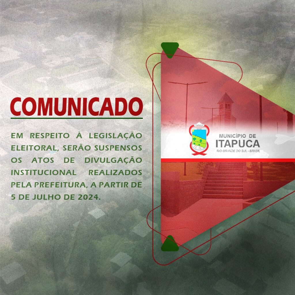 Em conformidade com a Lei Eleitoral, a Prefeitura de Itapuca anuncia a suspensão de todas as comunicações institucionais durante o período de três meses que antecede as eleições municipais. A decisão entra em vigor a partir do dia 5 de julho de 2024.