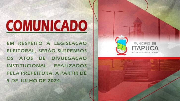 Em conformidade com a Lei Eleitoral, a Prefeitura de Itapuca anuncia a suspensão de todas as comunicações institucionais durante o período de três meses que antecede as eleições municipais. A decisão entra em vigor a partir do dia 5 de julho de 2024.