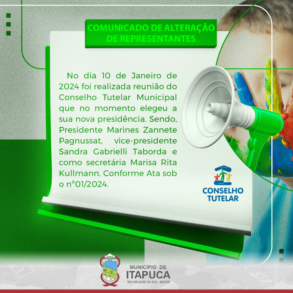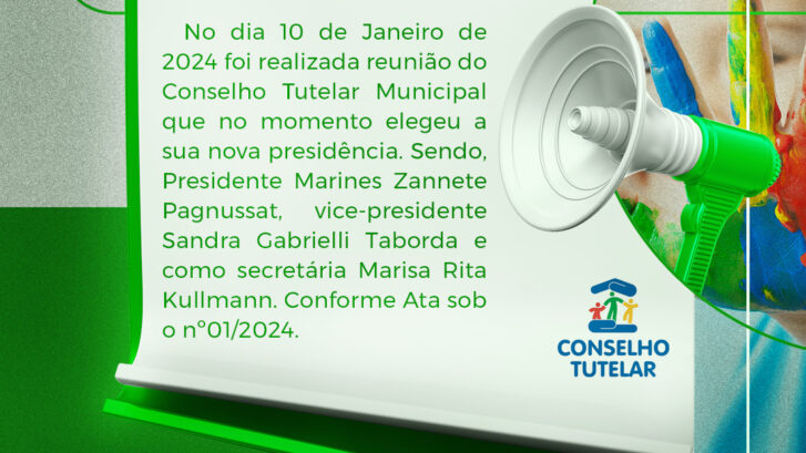 No dia 10 de Janeiro de 2024 foi realizada reunião do Conselho Tutelar Municipal que no momento elegeu a sua nova presidência. Sendo, Presidente Marines Zannete Pagnussat, vice-presidente Sandra Gabrielli Taborda e como secretária Marisa Rita Kullmann. Conforme Ata sob o nº01/2024.