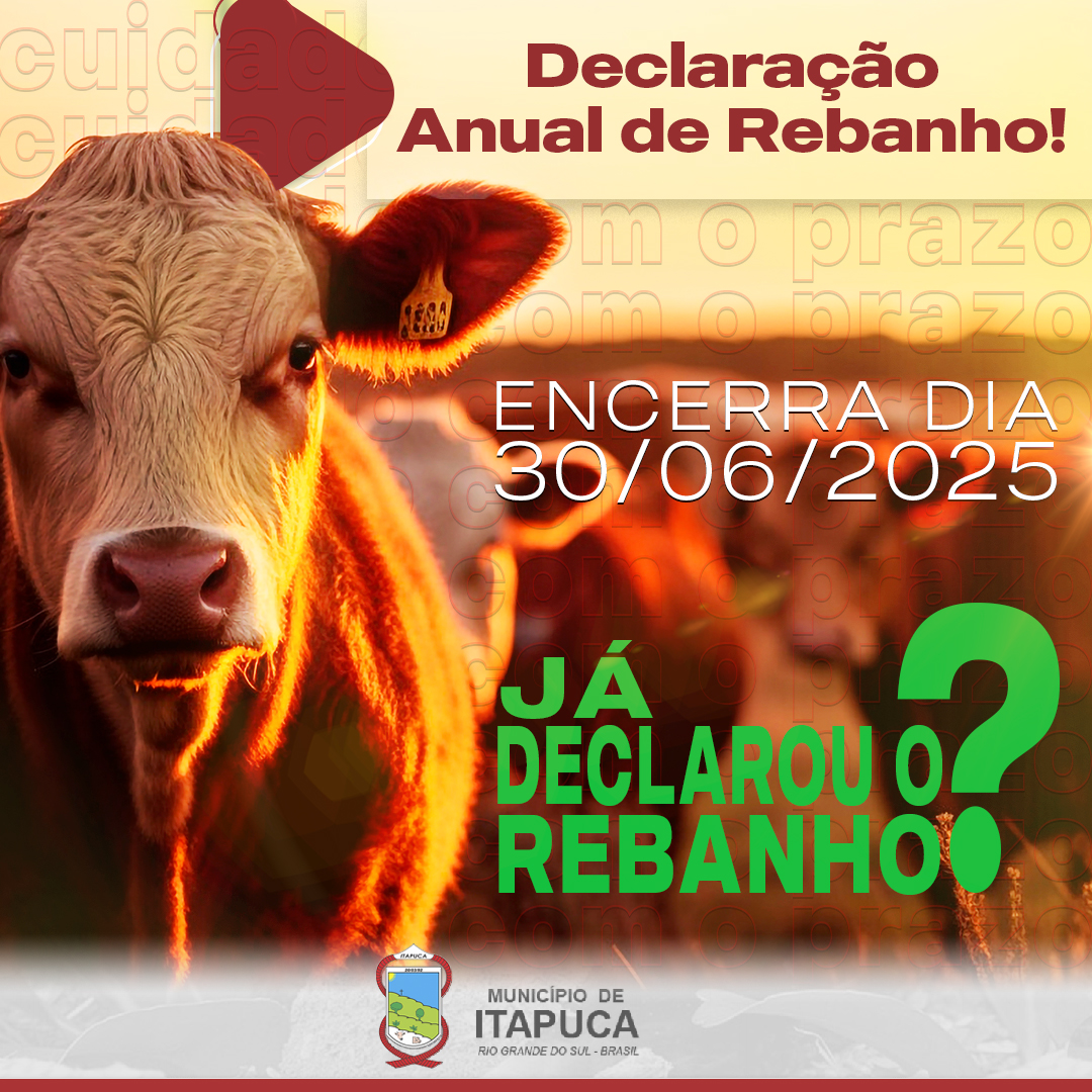 O Escritório de defesa Agropecuária de Itapuca avisa os produtores que já iniciou no dia 01/04/25 a Declaração anual de rebanho 2025 e vai até o dia 30/06/25. Relembra os produtores que essa declaração é obrigatória e pode acarretar em multa / auto infração. Pedimos que não deixem para fazer a declaração nos últimos dias.