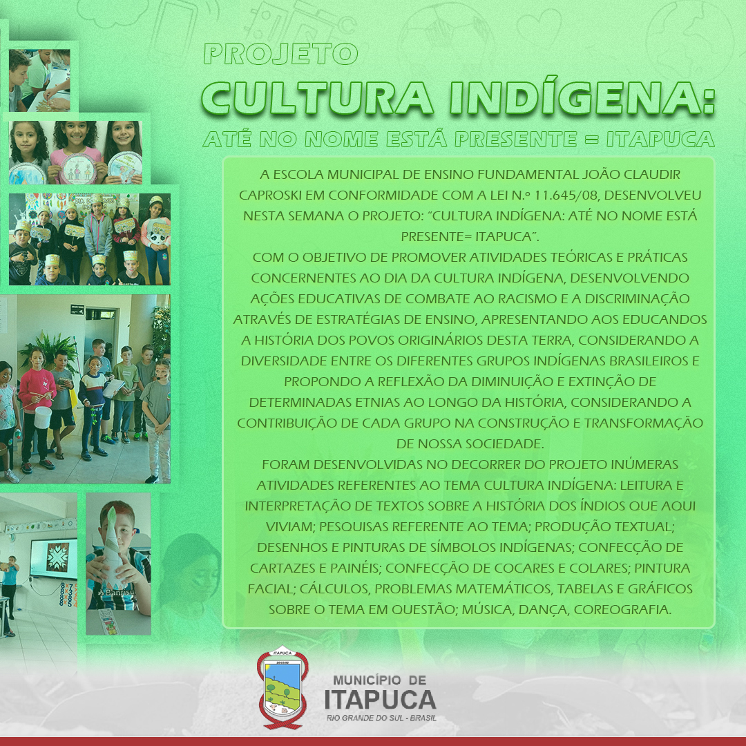 A Escola Municipal de Ensino Fundamental João Claudir Caproski em conformidade com a Lei n.º 11.645/08, desenvolveu nesta semana o Projeto: “Cultura Indígena: Até no nome está presente= ITAPUCA”.