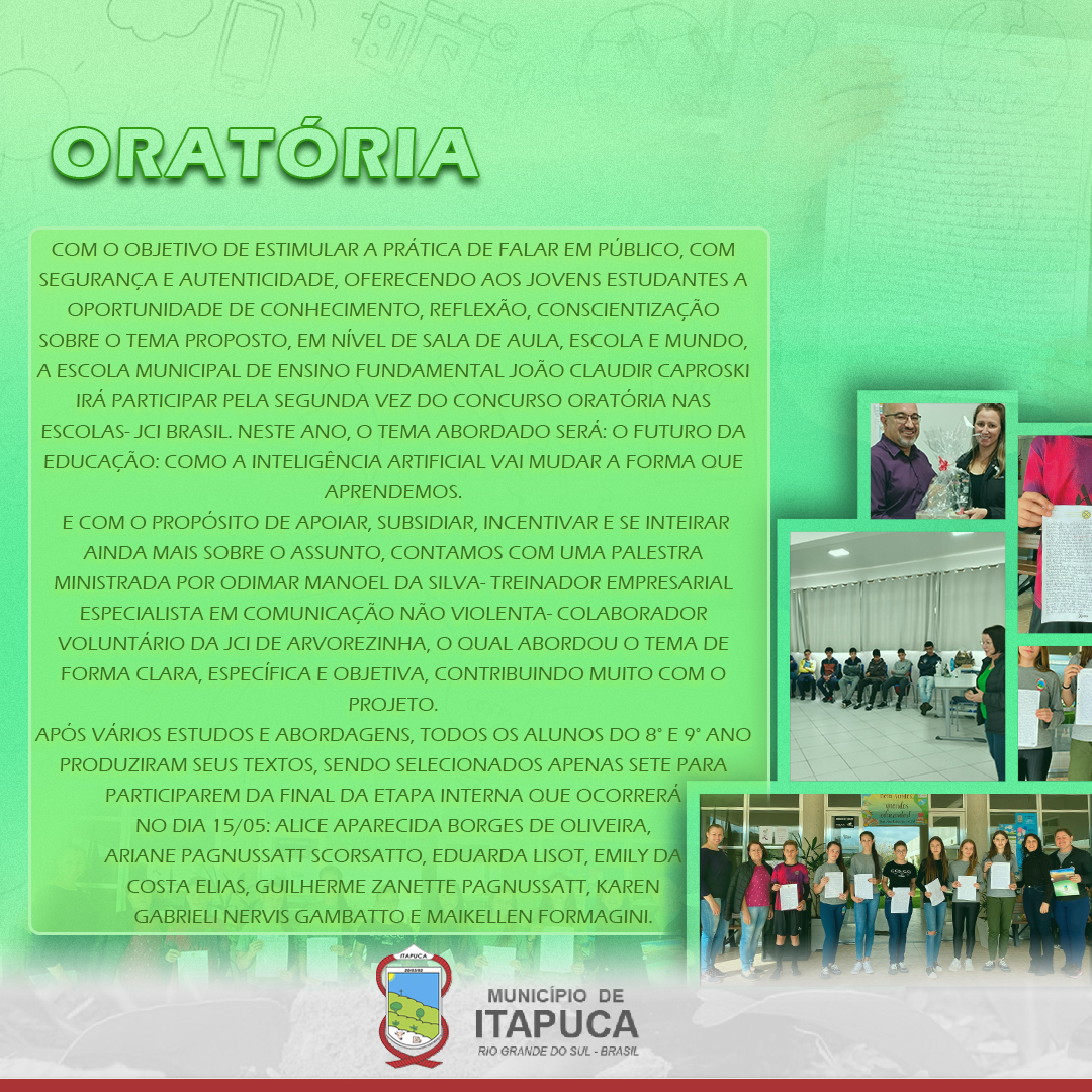Com o objetivo de estimular a prática de falar em público, com segurança e autenticidade, oferecendo aos jovens estudantes a oportunidade de conhecimento, reflexão, conscientização sobre o tema proposto, em nível de sala de aula, escola e mundo, a Escola Municipal de Ensino Fundamental João Claudir Caproski irá participar pela segunda vez do Concurso Oratória nas Escolas- JCI Brasil.