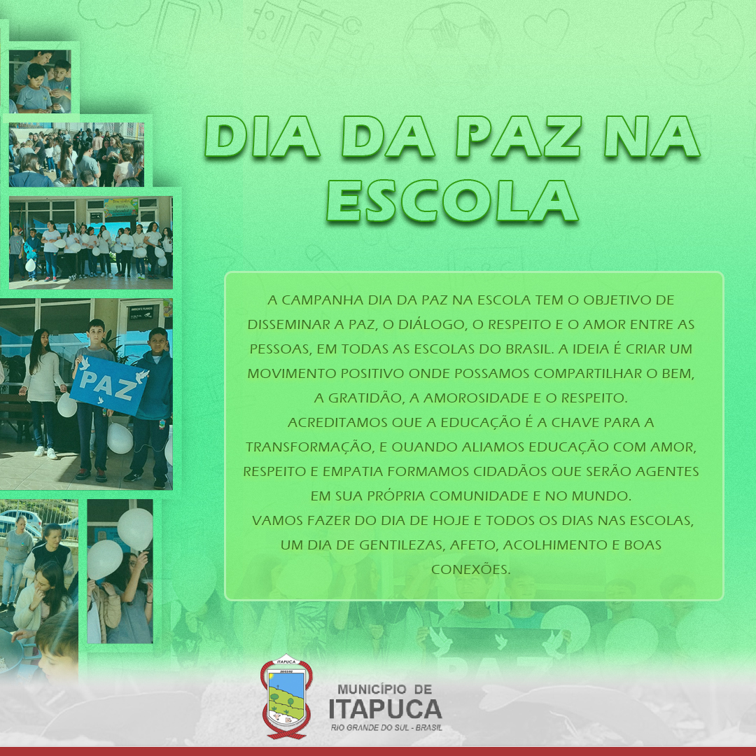 * A CAMPANHA DIA DA PAZ NA ESCOLA tem o objetivo de disseminar a paz, o diálogo, o respeito e o amor entre as pessoas, em todas as escolas do Brasil. A ideia é criar um movimento positivo onde possamos compartilhar o bem, a gratidão, a amorosidade e o respeito. Acreditamos que a educação é a chave para a transformação, e quando aliamos educação com amor, respeito e empatia, formamos cidadãos que serão agentes em sua própria comunidade e no mundo. Vamos fazer do dia de hoje e todos os dias nas escolas, um dia de gentilezas, afeto, acolhimento e boas conexões.