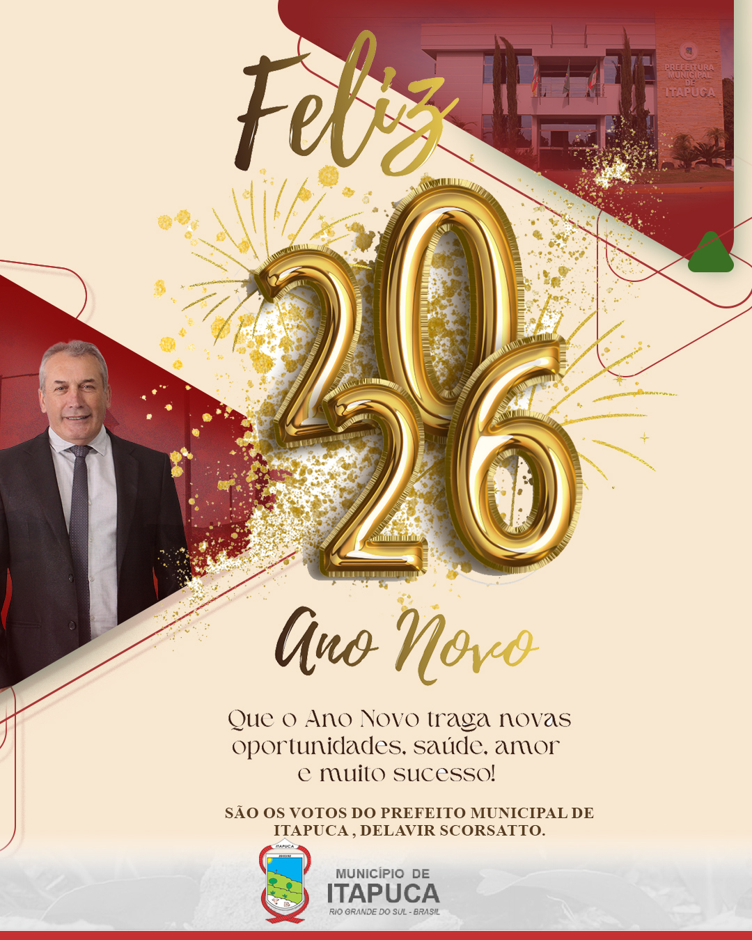 Que o novo ano que se inicia traga saúde, paz, esperança e novas oportunidades para cada família itapuquense. Que possamos seguir caminhando juntos, fortalecendo nossas comunidades, valorizando o trabalho, a educação, a agricultura e tudo aquilo que faz de Itapuca um lugar especial para viver.