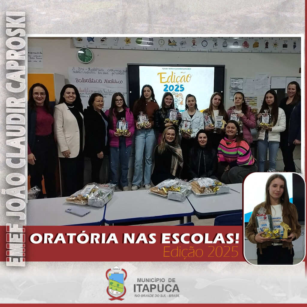 No dia 28 de maio de 2025 a EMEF João Claudir Caproski, realizou pela parte da manhã, o concurso entre os educandos do 8º e 9º ano, para selecionar o representante de nossa escola municipal, onde foi realizada a escolha do finalista do Concurso de Oratória nas Escolas – Fase Interna, com a participação dos jurados: Secretária de Educação e Esportes de Itapuca – Analice Sebben Casagrande, Professora de Língua Portuguesa – Carina Cavalini de Lima, Professora de Ciências e Senior da JCI de Arvorezinha – Micheline de Almeida, Membro da JCI de Arvorezinha – Renata Radaelli Moretto e a Advogada especialista em oratória – Maria Giziane Borges.