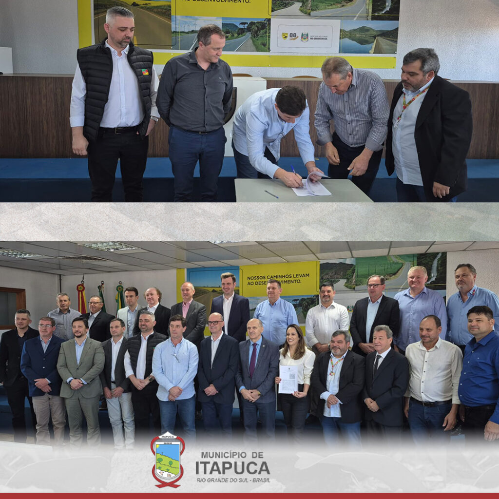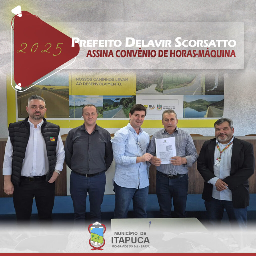 No dia de hoje, o Prefeito Municipal Delavir Scorsatto esteve na Secretaria de Desenvolvimento Urbano e Metropolitano (SEDUR), em Porto Alegre, para a assinatura de convênio referente ao programa de horas-máquina, iniciativa que visa fortalecer as ações de infraestrutura e apoio às comunidades do interior de Itapuca.