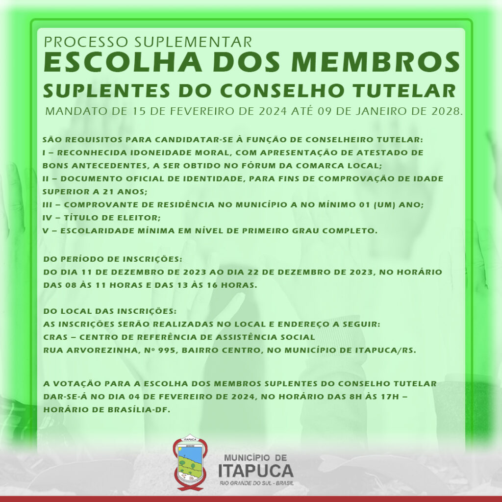 PROCESSO SUPLEMENTAR DE ESCOLHA DOS MEMBROS SUPLENTES DO CONSELHO TUTELAR, para o mandato de 15 de fevereiro de 2024 até 09 de janeiro de 2028.