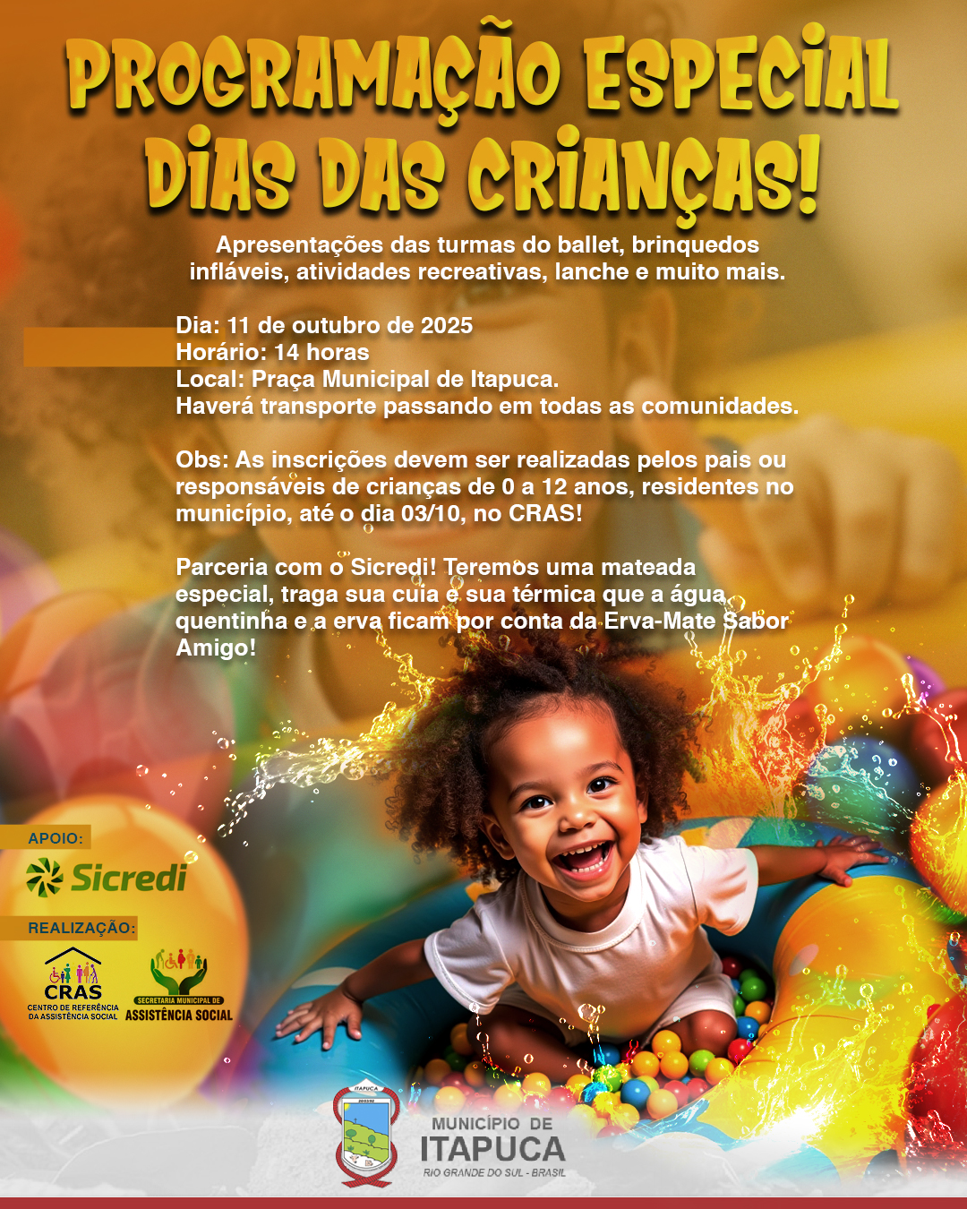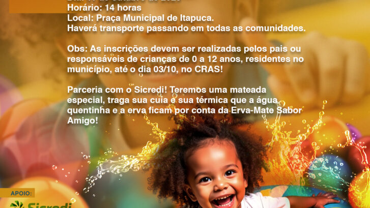 Haverá transporte passando em todas as comunidades.Obs: As inscrições devem ser realizadas pelos pais ou responsáveis de crianças de 0 a 12 anos, residentes no município, até o dia 03/10, no CRAS